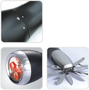 多功能工具手电筒 商品重量:135克 光源形式:LED 产品尺寸:14*4.5*4.5cm 产品材质:ABS+电子元原 装箱数量:100pcs 装箱规格:47.5*30*25cm 加印LOGO: 可以 适用送礼场合:广告促销、商务馈赠、颁奖纪念、展销会、周年庆典、开业典礼、公关策划、其他。 特点: 造型时尚,无论是展开还设收合都是件美观大方的艺术品; 采用不锈钢拉丝工艺,尽显尊贵; 瑞士军刀十多种功能与电筒完美结合; 在多种场合皆能派上用场; 采用4个高亮LED灯和一个红色警示灯。 功能说明: 1.配有4个高亮度LED手电,1个红色高亮反复闪光式警示灯。 2.刀具部分为金属外壳不锈钢。 3.配有剪刀,锉刀,一字螺丝刀,十字螺丝刀,啤酒罐头起子,大小螺母扳手,锐利小刀,坚韧小据,坚韧大据,钉子起子。 4.需要配置7#的电池三节。 |