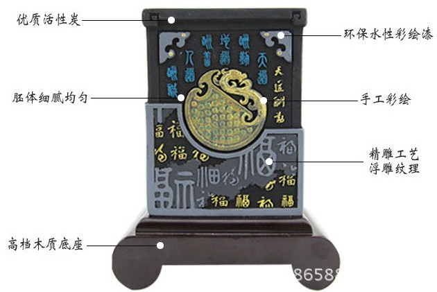 1、 全天然:不含任何化学物质,采用优质活性炭压制雕刻成型,时尚美观。